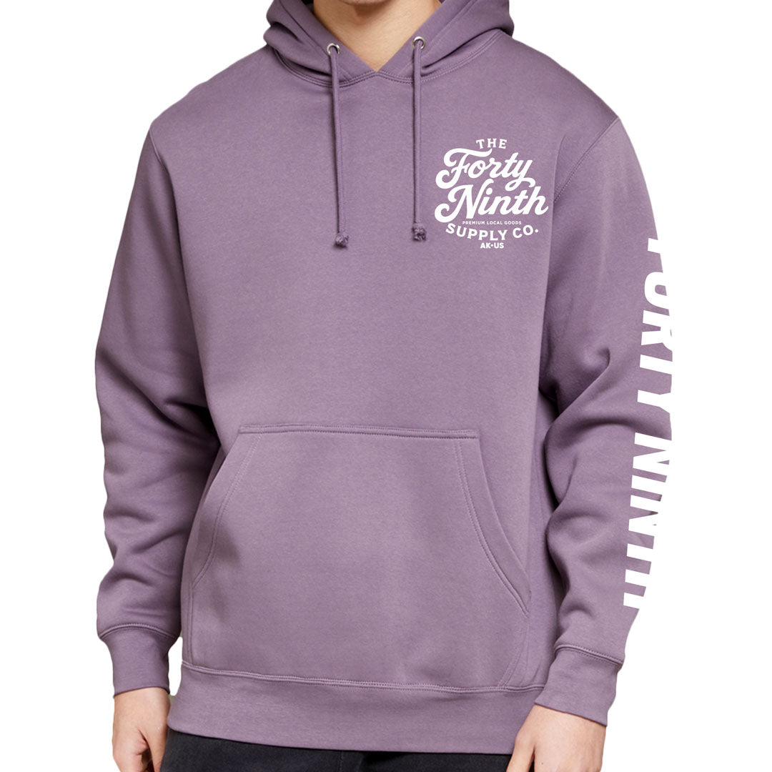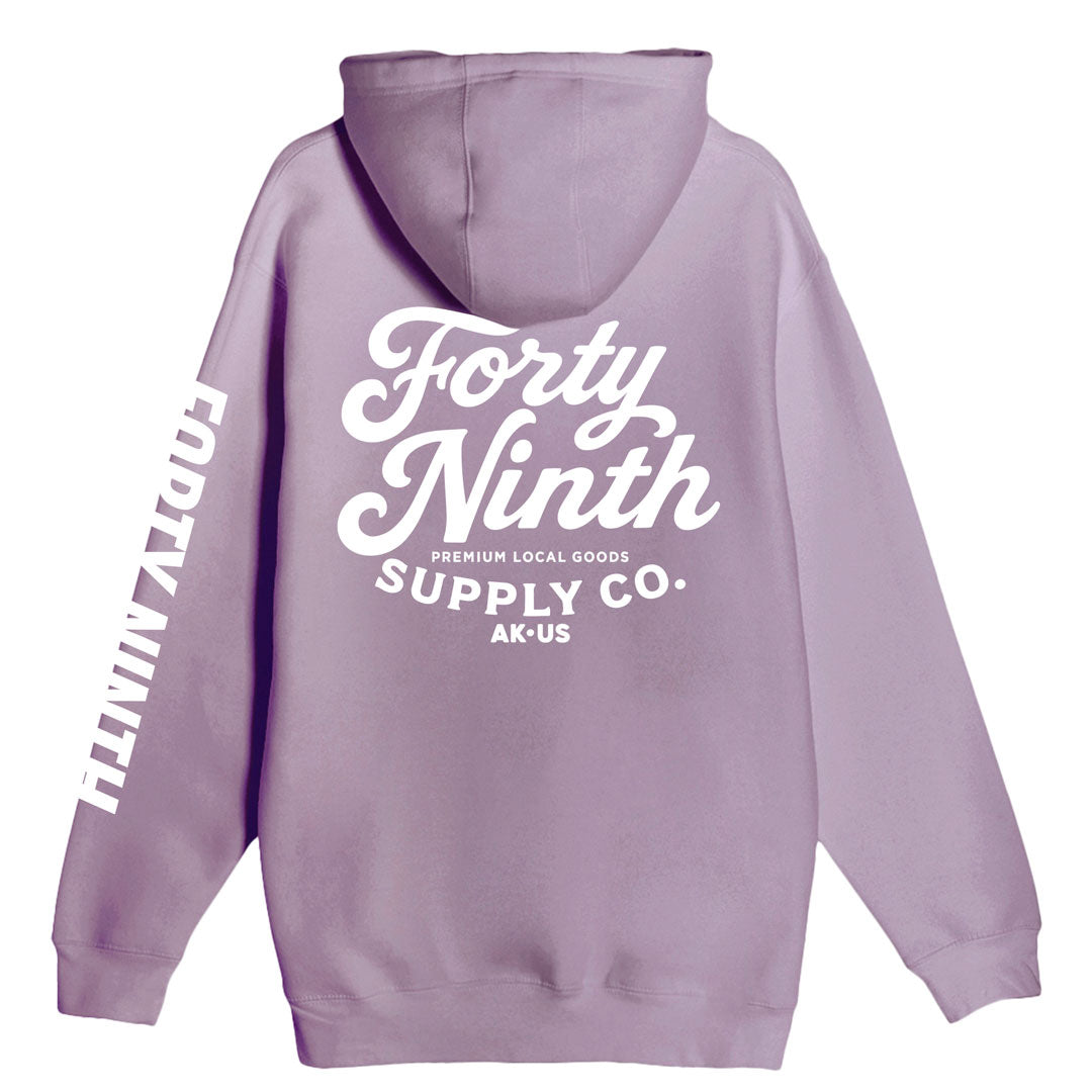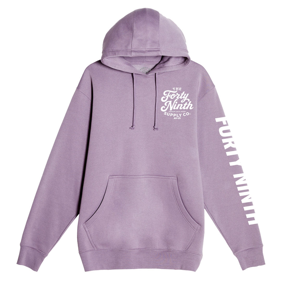 Forty Ninth Script Lavender Hoodie. One-color screen printed design on the front and back. Forty Ninth design on one sleeve. Unixsex Hoodie. A relaxed yet sturdy fit. This 10 oz, 3-end fleece unisex heavyweight pullover hoodie was designed for comfort, warmth, and durability.