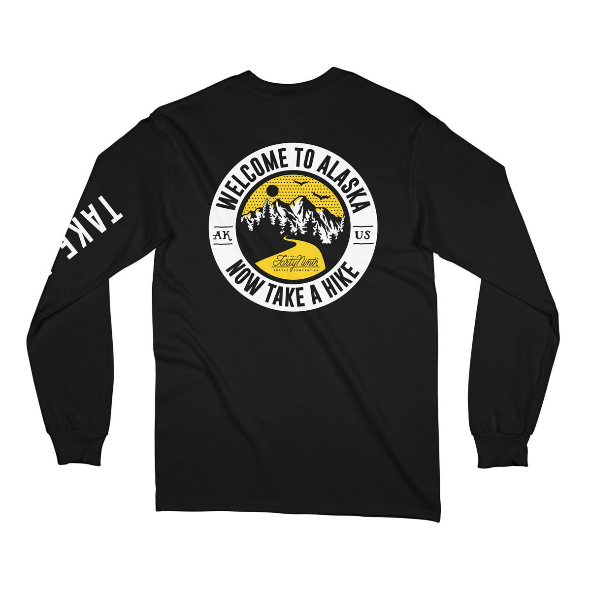 Take a Hike Long Sleeve Black T-Shirt. 2 color screen printed design on the front and back. 1 color screen printed design on the right sleeve.