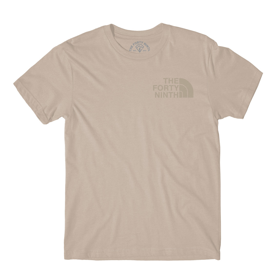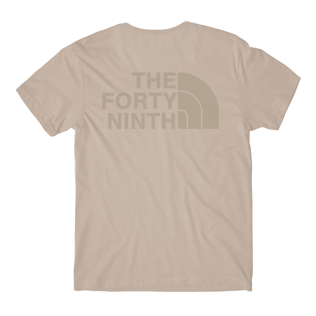 The Forty Ninth Tan T-Shirt. Screen printed 2 color graphic on the front and back.