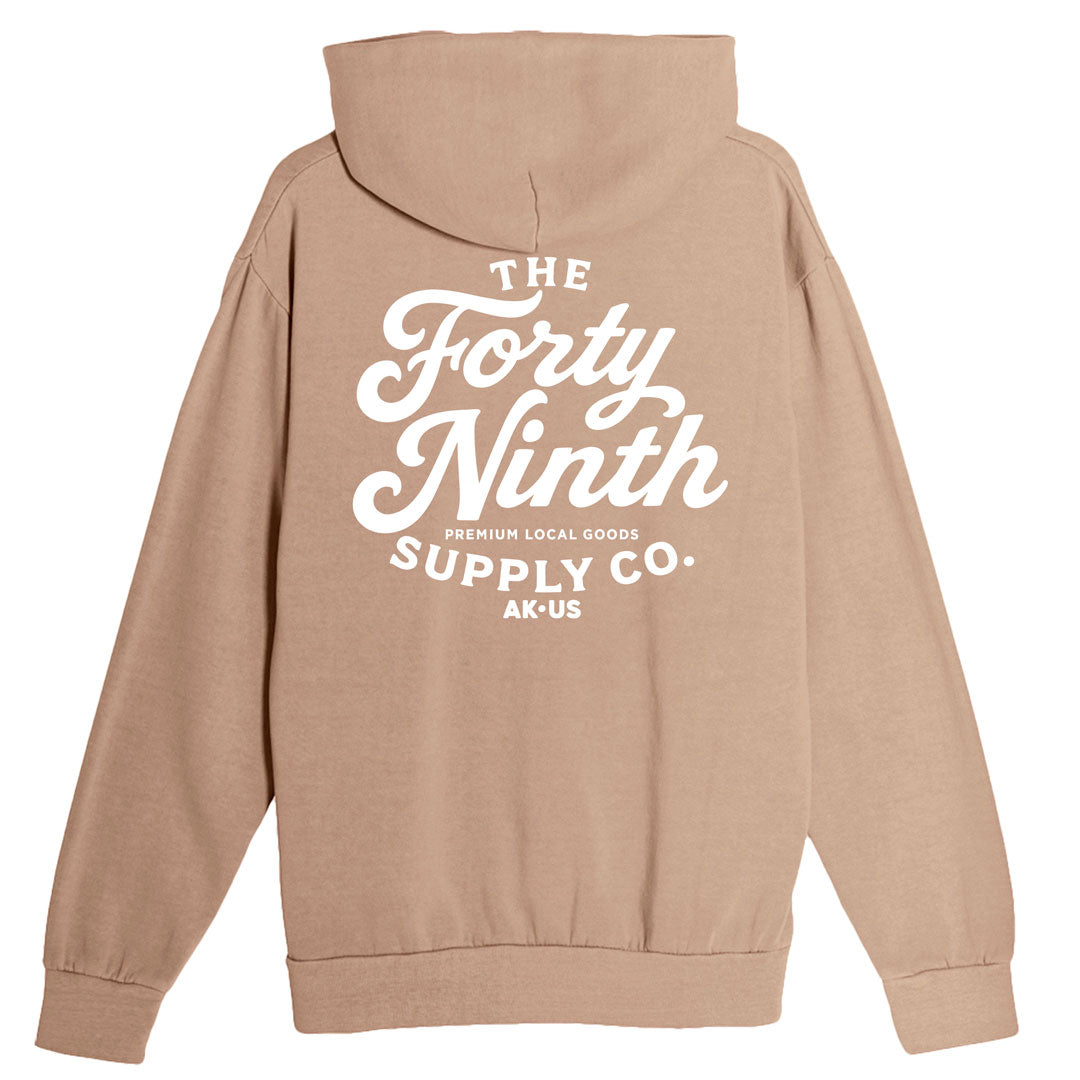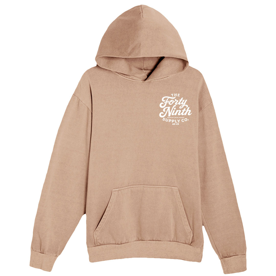 Forty Ninth Vintage Tan Hoodie. Pigment Dyed. 1 color screen printed graphic on the front and back. Heavyweight fleece. No drawcords. Two-panel hood with double-needle topstitching on all seams. 1x1 ribbing at cuffs and waistband. Under 5% shrinkage.